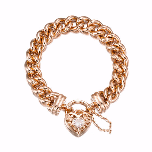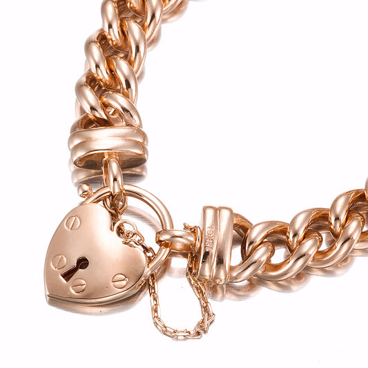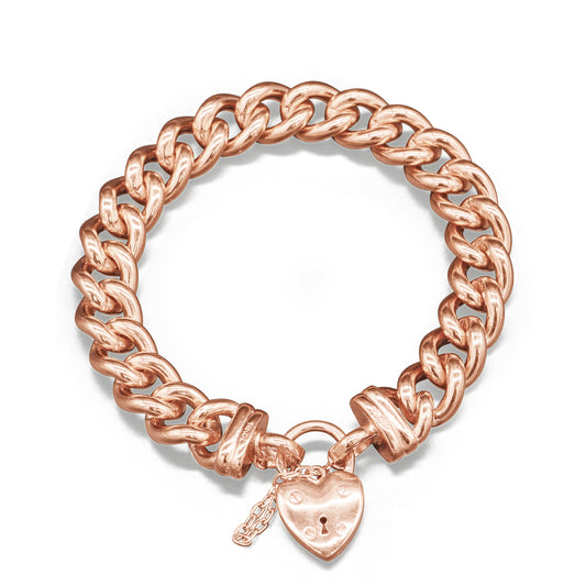 18ct Heavy Rose Gold Plated 12mm Euro Curb Chain Bracelet with a Small Plain Heart Locket - USA Made